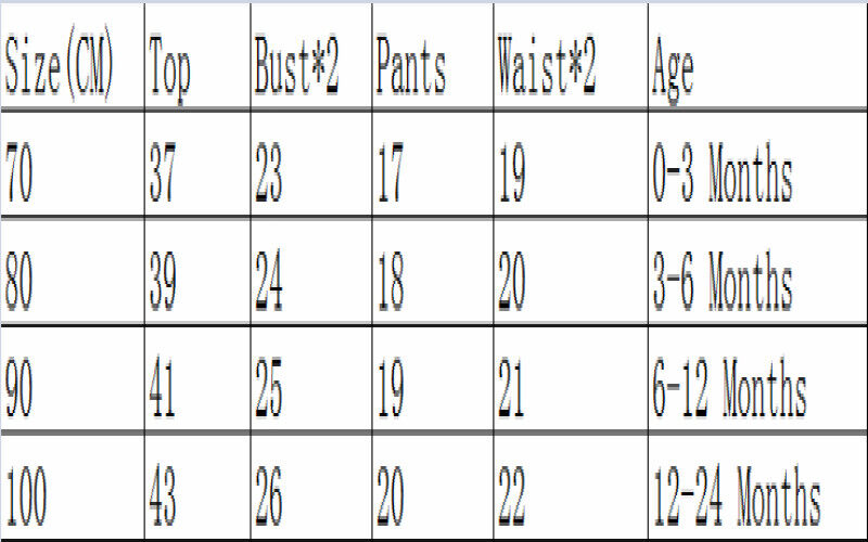 80 Top length: 15.35 Bust*2: 9.45 Pants length: 7.09 Waist*2: 7.87 Age: 3-6 Months