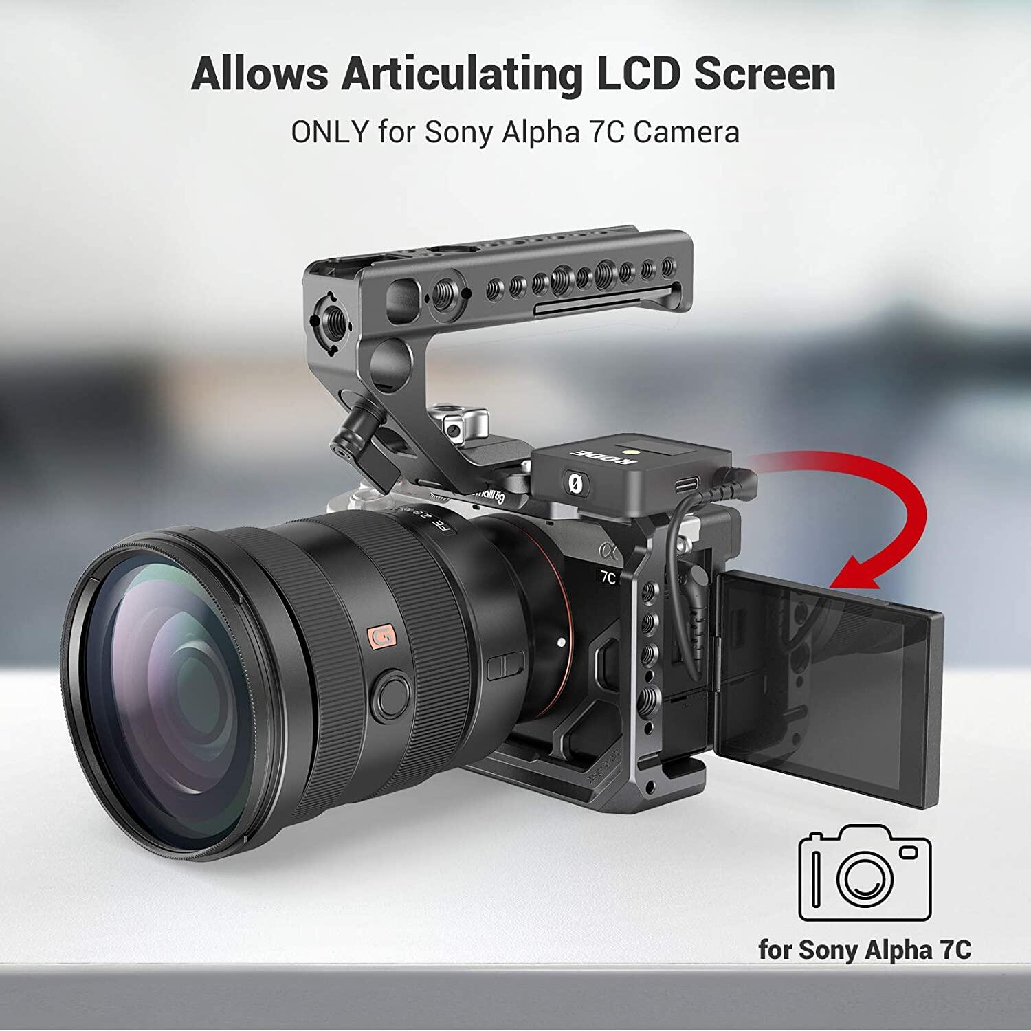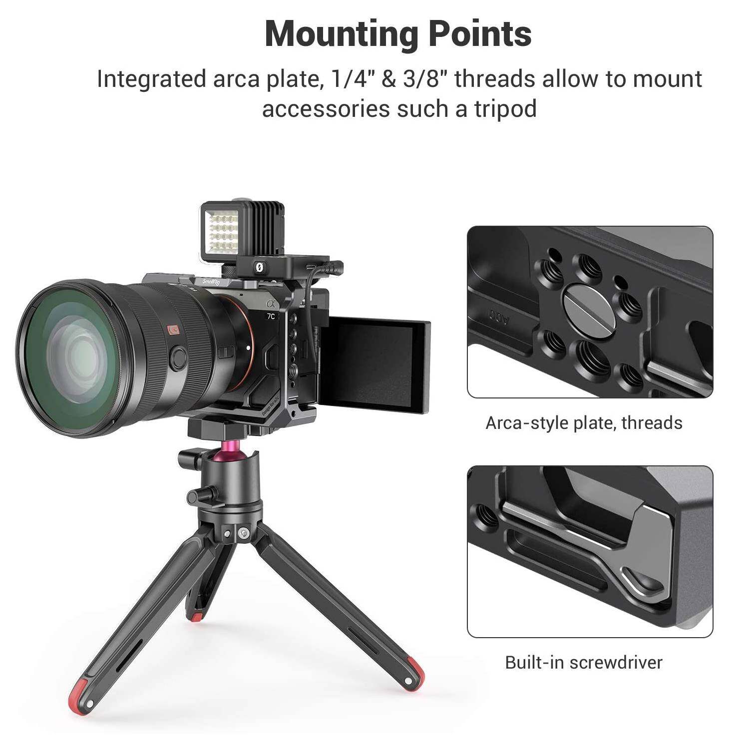 SmallRig Cage for Sony A7C 3081 is a form-fitting full cage specifically designed for Sony A7C. It is lightweight and compact. To maximize the mounting options, the cage can be seamlessly integrated to the camera and features multiple 1/4”-16, 3/8”-20, ARRI thresholds, and cold shoe, which enable filmmakers to set the whole rig up within the compact body of the cage. With a built-in Arca-Swiss quick release system, the cage allows the fast switch between tripod shooting, handheld shooting, and gimbal shooting. The cage secures the camera via a 1/4”-20 screw on the bottom and an m2.5 screw on the right side to further prevent twisting. Additionally, the lightweight and ergonomic design are able to boost the grip experience to the greatest extend.