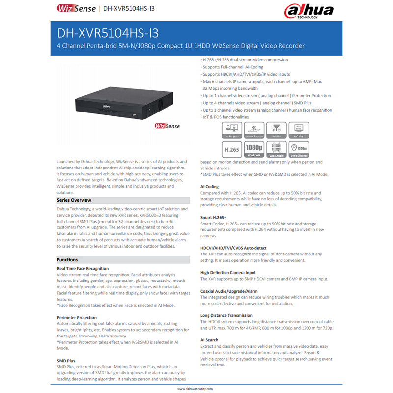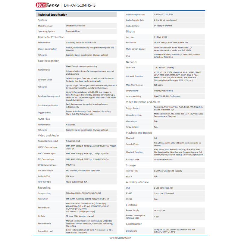 Dahua XVR5104HS-I3 4CH XVR [Penta-brid 5M-N/1080P Compact 1U WizSense 4 Channel Digital Video Recorder (DVR) PC-Mobile APP:iDMSS Lite/DMSS]
