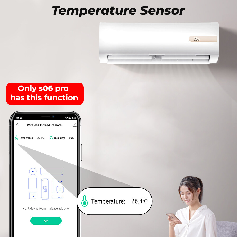 --[3 in 1] Infrared remote control + temperature + humidity Three functions are integrated together. You can remotely control these devices with a tap of your finger on the mobile app, or you can monitor temperature and humidity in real time on the app anytime, anywhere.