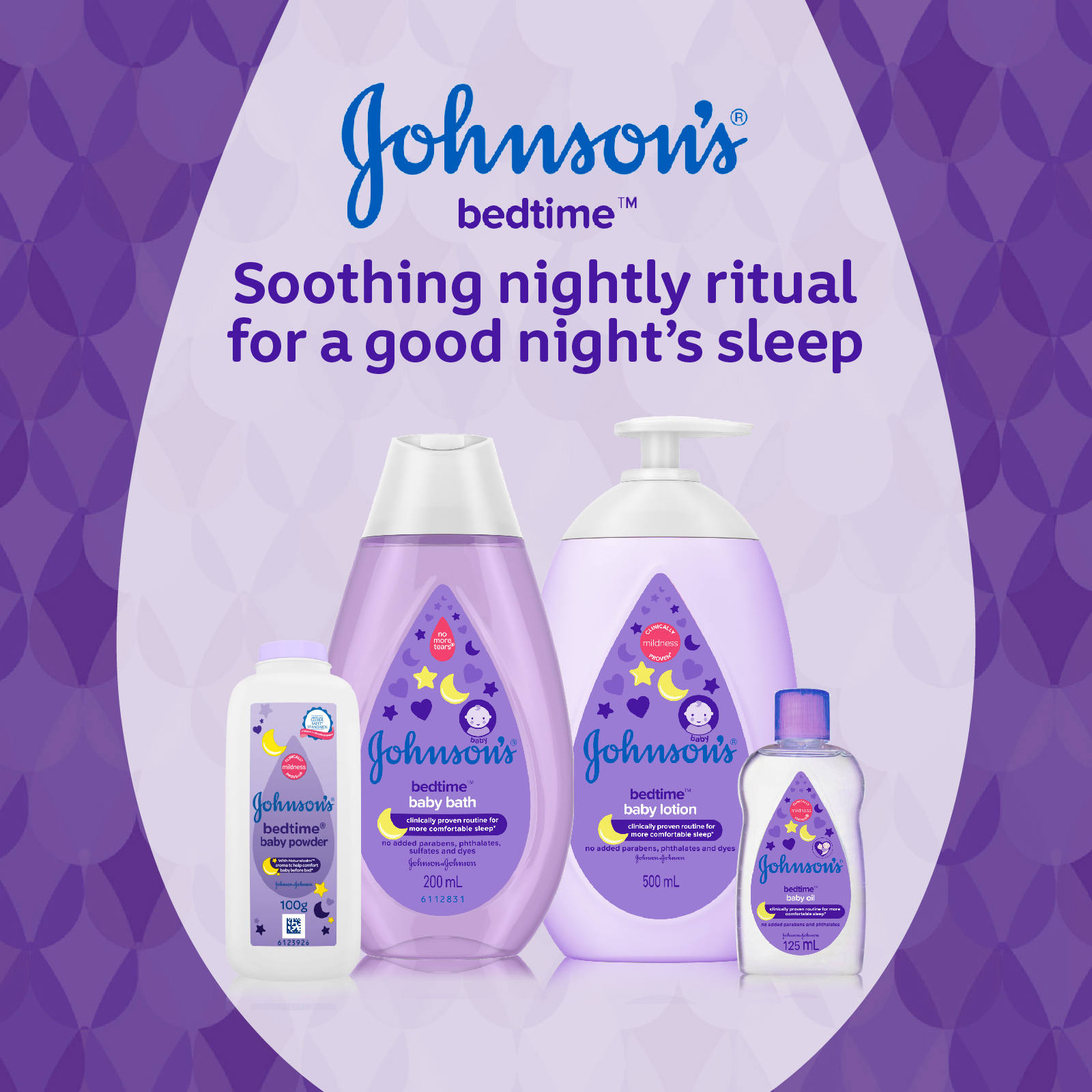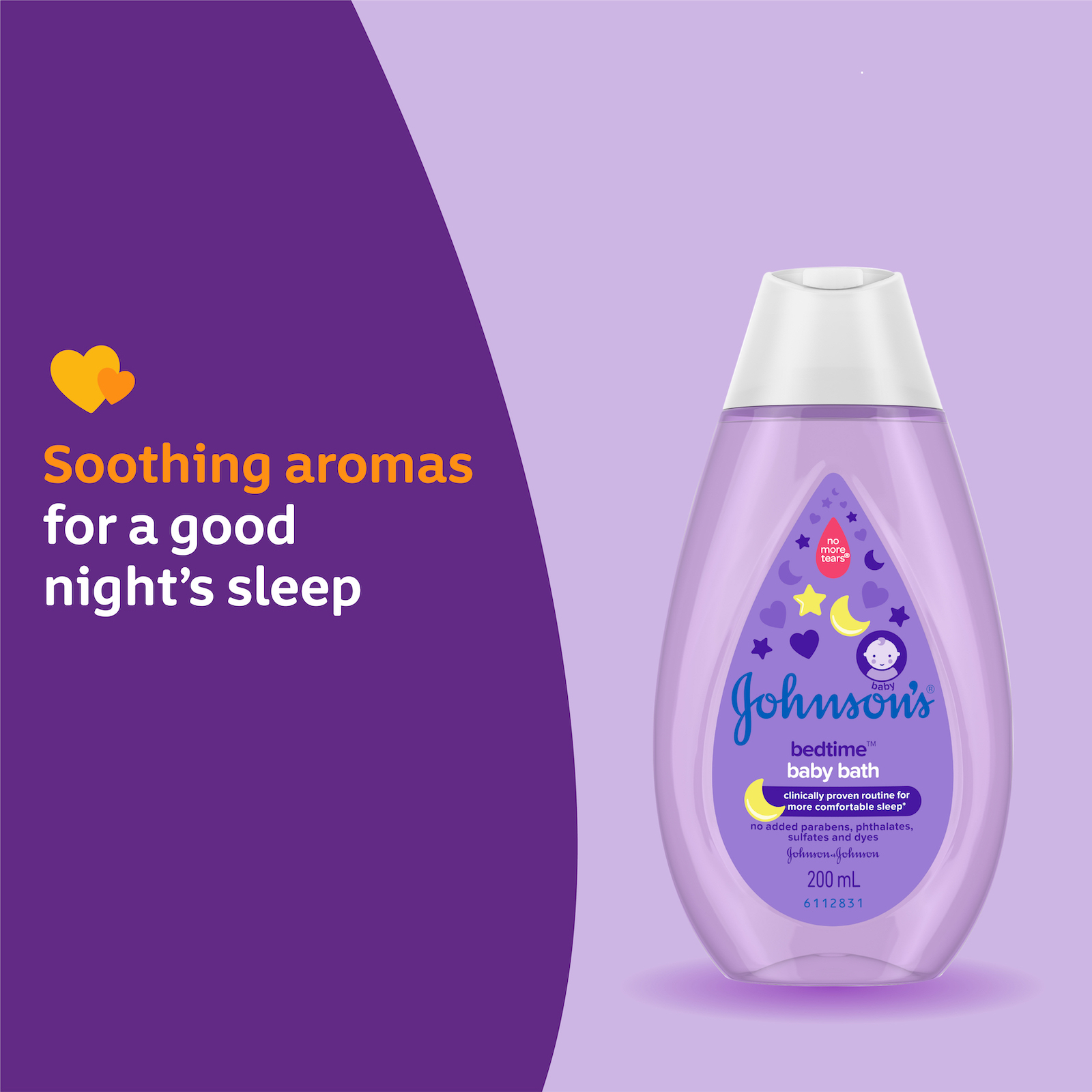 Johnson's® Bedtime™ baby bath with NaturalCalm® essence, clinically proven to help calm and comfort baby before sleep* (Did you know?) A soothing nightly ritual can help send your growing baby to dreamland. Our product compliments your baby’s bedtime routine for a comfortable night’s sleep.