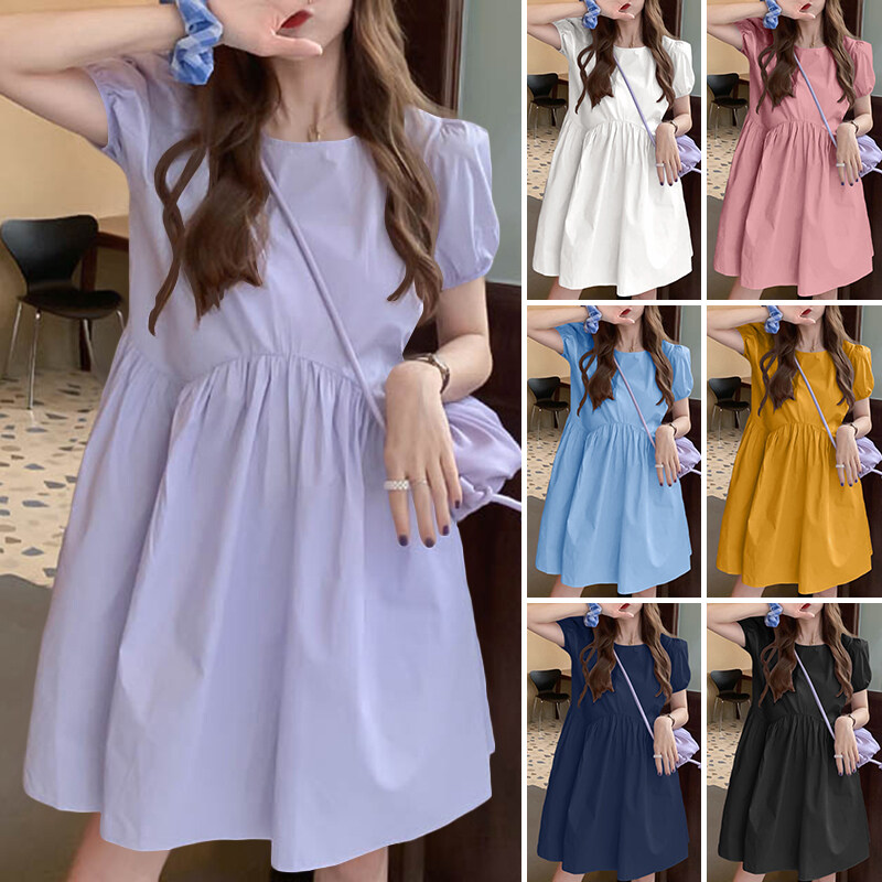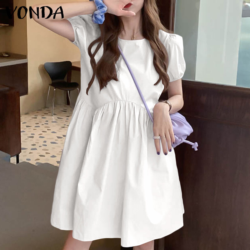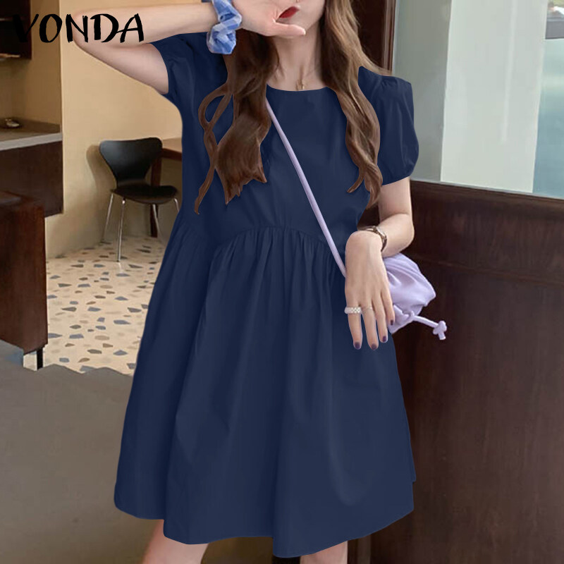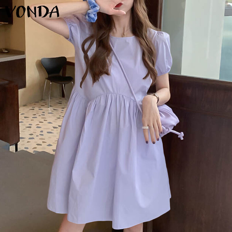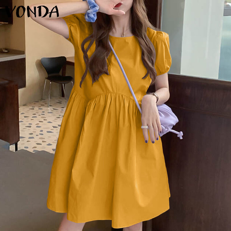 (Korean Causal) VONDA Womens Puff Sleeve Shirt Dress Holiday Casual Sundress Retro Solid Long Tops