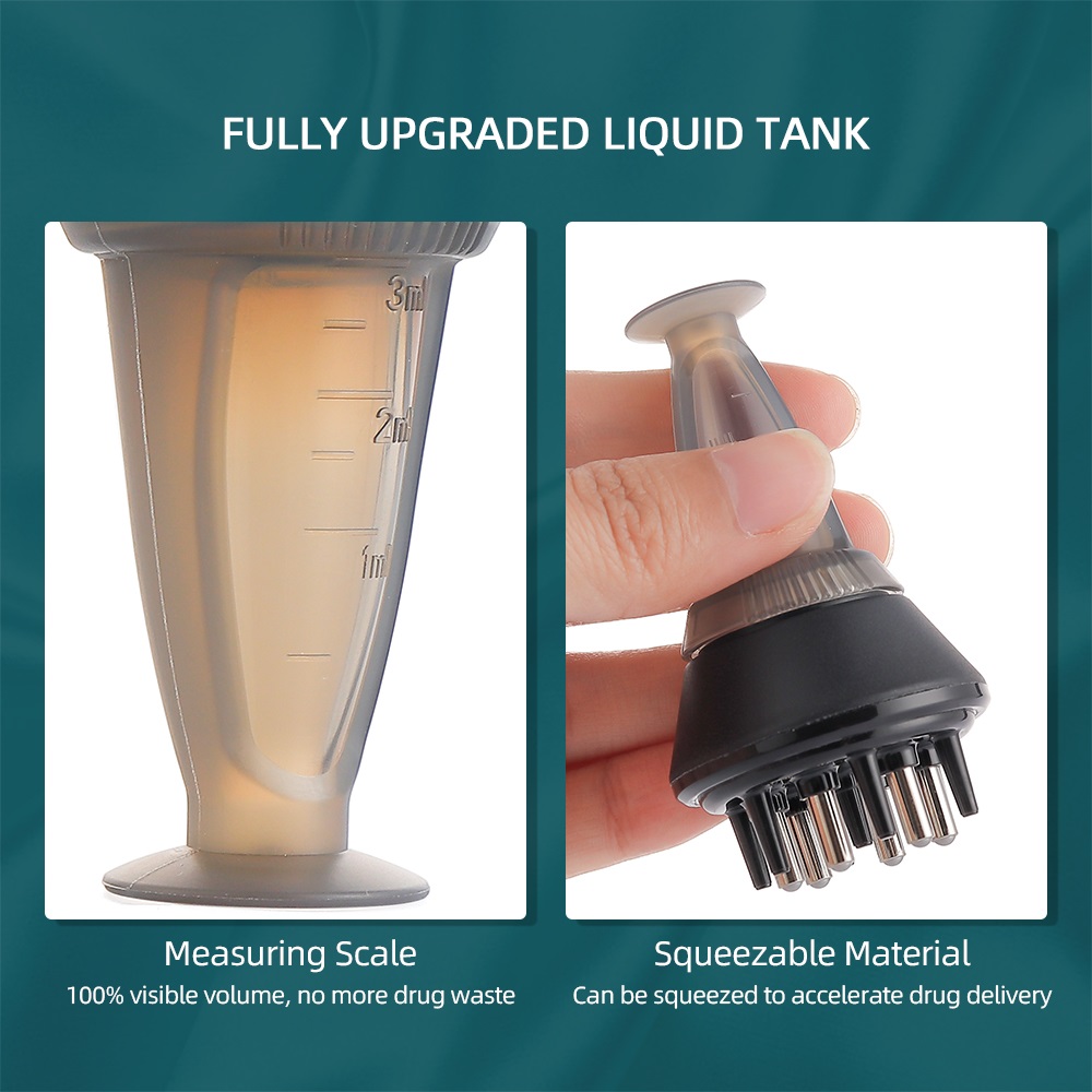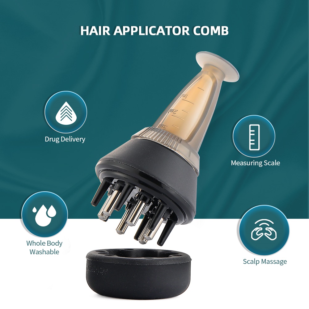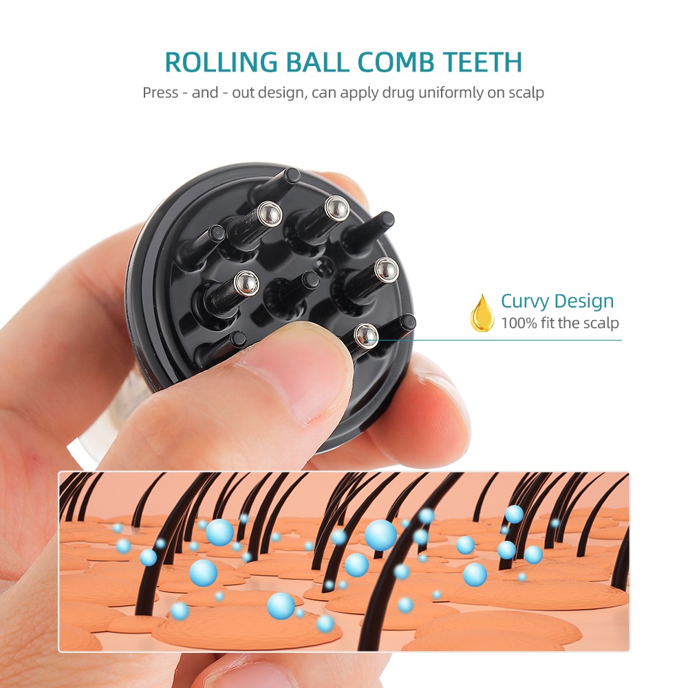 1. Perfect for Medicine Applying. Equipped with 6 elastic rolling ball teeth to introduce liquid medicine uniformly into the hair root, and a squeezable handle to control the volume. With it, youre free from hand stains and medicine waste.