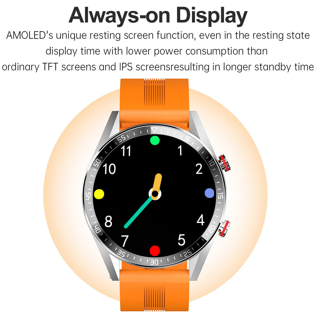 Selling Points:1.AMOLED Display with Idle status2.Bluetooth Phone Call function (Dial or pick up)3.Local Music Playing4.Personal Data Reviewing for Heart rate, Calories and Steps5.Always display the time6.Can Connect TWS earphoneStandout FeaturesHeart Rate Monitoring, Blood Pressure Monitoring, Goal-Based Exercises, Sleep QualityMonitoring, Steps Tracking, Calorie Burn Tracking, Daily Steps Goal, Real-time Pace & Distance,Goal Celebrations, Reminders To Move, Smartphone Notifications, One-click Reject/Mute,Weather Forecast, CountDown & Stopwatch, Alarm Clock, Multi-watch Faces (10), Find Phone,Turn Wrist Detection, Music Control, Shake Take Photo.APP: FitwinnerDisplay: 1.39inch AMOLEDResolution: 454*454Touch Panel: Full screen touchBattery: 300MahCharging method: Magnetic chargingWaterproof: IP67 life waterproofBluetooth version: BLE5.0Bluetooth calls: BT3.0System version: Android above 5.0 or IOS above 9.0Watch Language: Chinese, English, French, Spanish, Russian, Portuguee, Thai, Arabic