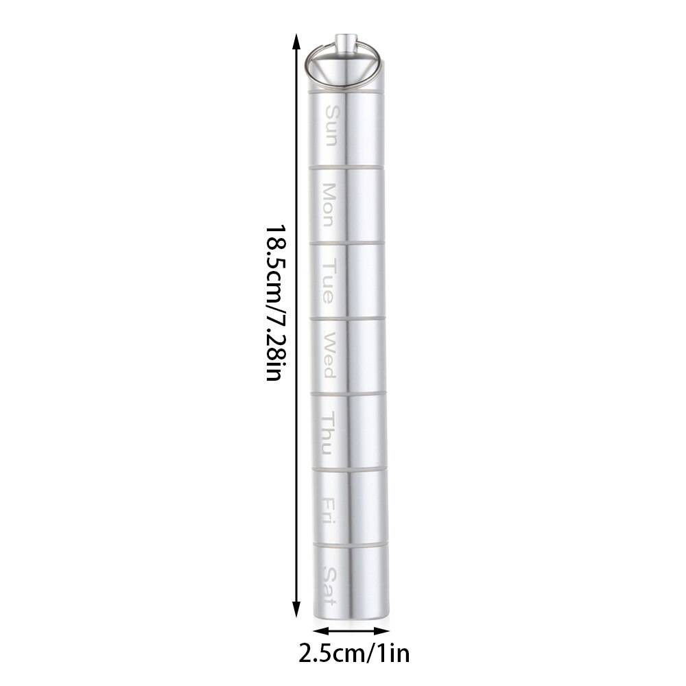 Condition: Brand new Item Type: Pill Cases & Splitters Material: Aluminum Alloy Size: 25*185mm Color: as picture show Features: 1. This pill case has totally 7 compartments that detachable and adjustable. 2. The letters from SUN to SAT are carved on the surface of the 7 compartments, meaning 7 days of a week. This helps you organize the pills well without confusing. 3. The travel pill case has good sealing,every compartment has a rubber sealing ring. So this pill case has good dustproof,waterproof performance. It can keep the pills dry and clean,no deterioration. Moreover,it is odorless,safe to use. 4. Made of aluminum alloy material,sturdy,light-weight,shockproof and anti rust, durable to use. 5. There is a keychain on the cap,you can hang it on the bag or keyring, a humanized and intimate design, perfect for fishing, hiking, riding, climbing and travel first aid. Package Included: 1 x pill storage box(pill is not included)
