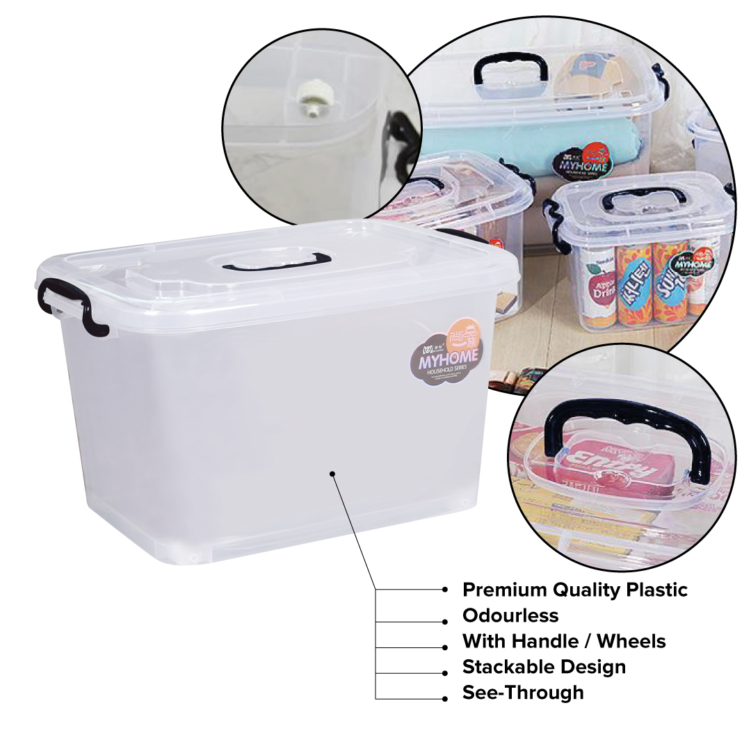 LAURA TRANSPARENT STORAGE BOX, STACKABLE DESIGN WITH HANDLE AND WHEELS. MAKES MOVING AND CLEANING EASIER AND HASSLE FREE.