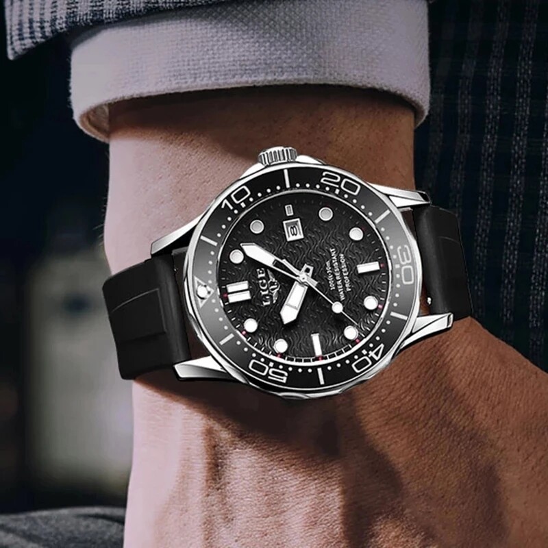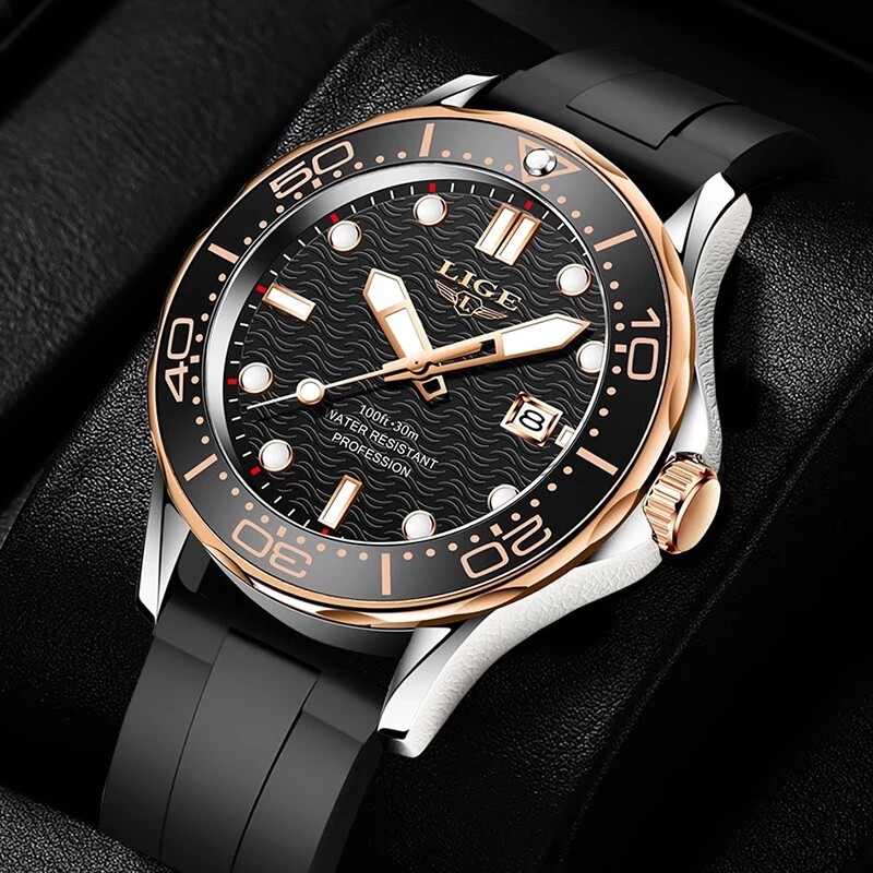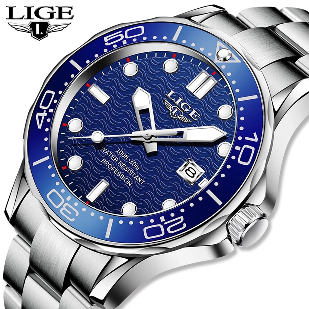 LIGE Sport Diver Watches For Men Stainless Steel Waterproof Date Clocks Men Watch Military Quartz Watch + Box