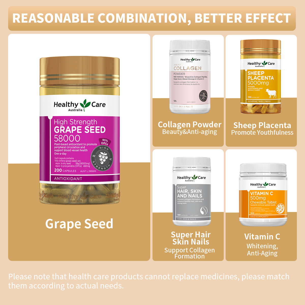 Healthy Care High Strength GrapeSeed 58000 is an advanced formula of a powerful plant-based antioxidant. It contains a rich natural source of flavonoids, including Oligomeric proanthocyanidins (OPCs), which protects the body cells from damage caused by free radicals.Healthy Care High Strength GrapeSeed 58000 is formulated with high quality ingredients to:- Help enhance collagen formation.- Maintain blood circulation to the peripheral areas of the body (legs, hands and feet).- Maintain cardiovascular system health.- Maintain blood capillary and vessel health.Benefits include:- Helps reduce free radical damage to body cells.- Helps to maintain general health and wellbeing.- Helps enhance blood circulation to the peripheral areas of the body (legs, hands and feet).- Helps to maintain cardiovascular system health.- Helps to maintain blood vessel and capillary health.Each capsule contains:Vitis Vinifera (GrapeSeed) extractEquiv. to dry grapeseed 58 g (58000 mg)Equiv. to procyanidins (OPC) 460 mgAdults: Take 1 capsule daily or as directed by your healthcare professional.Children under 12 years: Only as professionally prescribed.