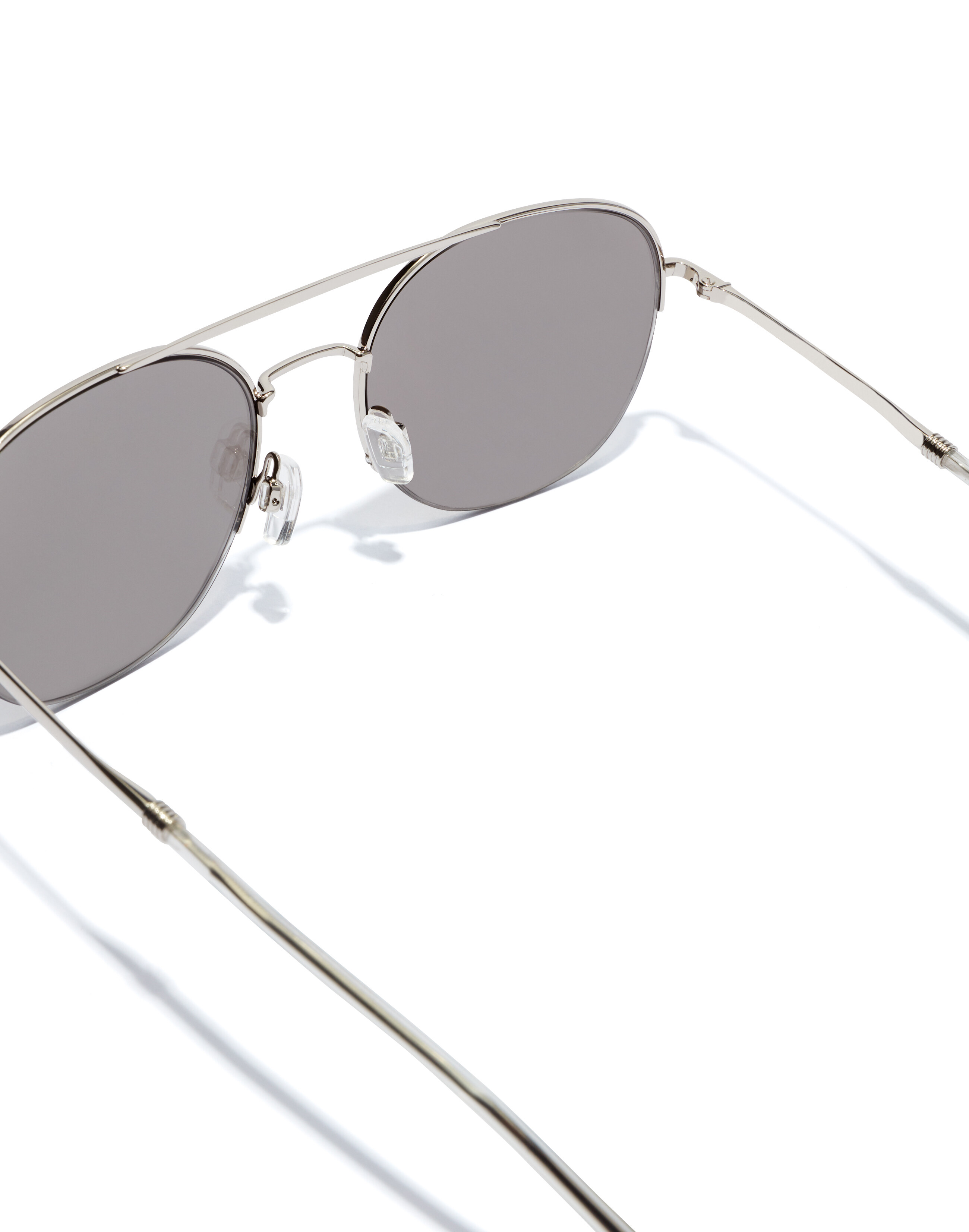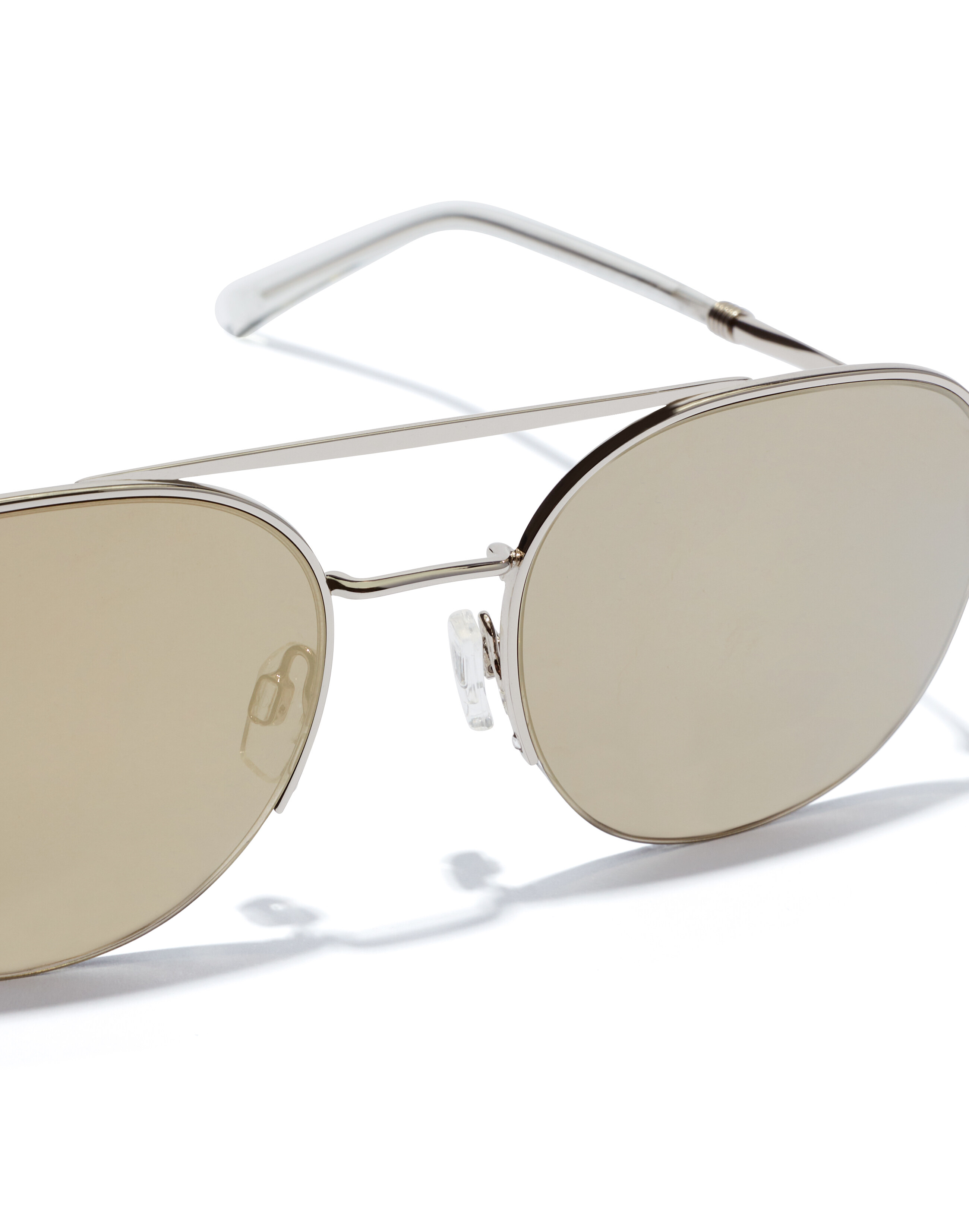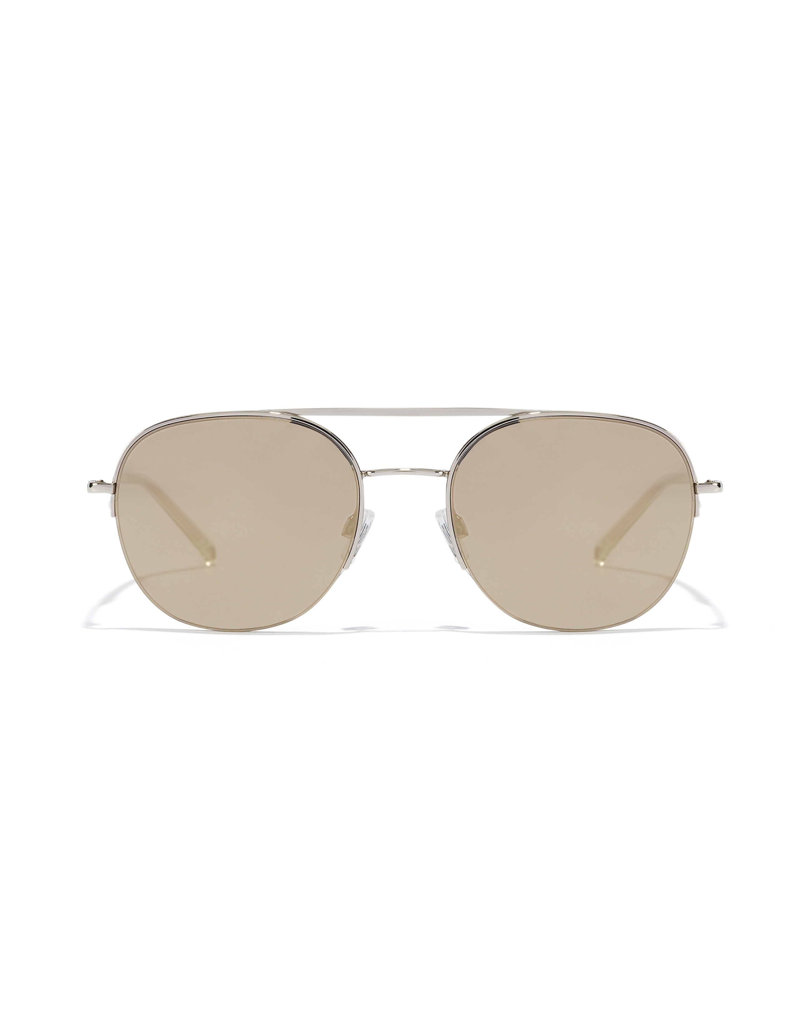 A rounded aviator-style metal frame in polished silver with classic double-bridge, slender temples with long, transparent ear pieces, offset half-rims and mirrored beige lenses.
