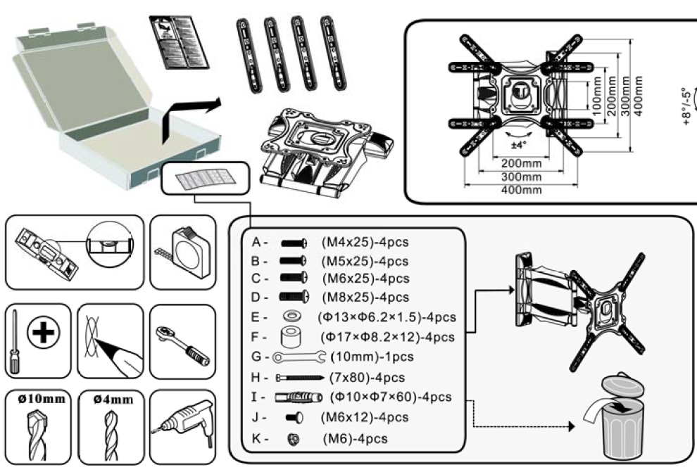 - VESA compliance from 100x100mm to 400x400mm