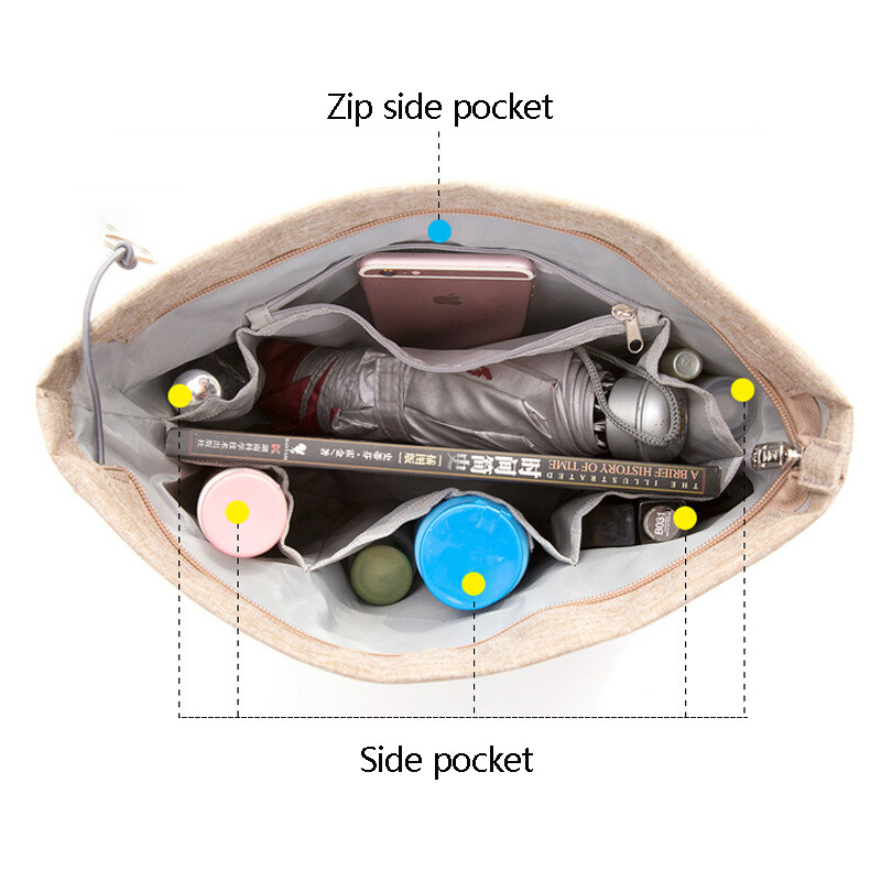 APPLICATION: All your things like umbrella, wallet, cosmetics, notebook, ipad, phone can be totally organised, your can find your things quickly and protect your bag from these stuffs.