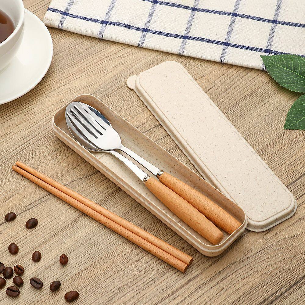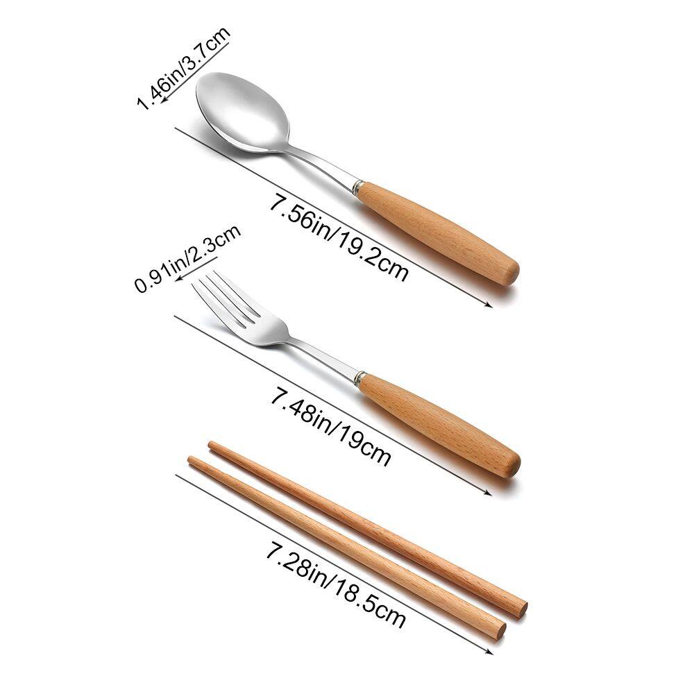 YH4F 3pcs Outdoor Travel Spoon Wooden Handle Stainless Steel Fork Utensils Tableware Flatware Set Cutlery Set
