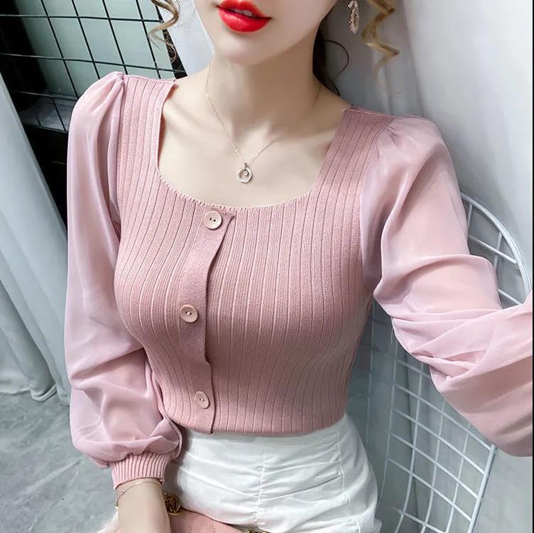 EDQRDQ Women's Puff Long Sleeve Contrast Mesh Square Neck Pullover Blouse Top