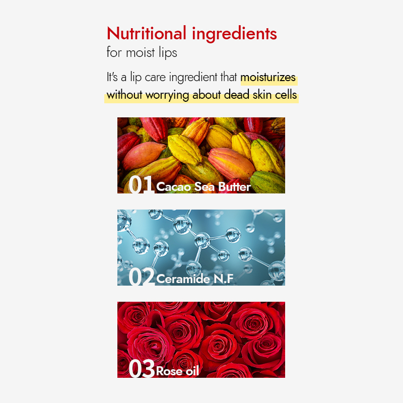 Tint: Isododecane, Diisostearyl Malate, Polyglyceryl-2 Triisostearate, Disteardimonium Hectorite, Methyl Trimethicone, Silica, Titanium Dioxide (CI 77891), Tricalcium Phosphate, Silica Silylate, Trimethylsiloxysilicate, Talc, Kaolin, Iron Oxides (CI 77492), Octyldodecanol, Polybutene, Propylene Carbonate, Synthetic Wax, Red 6 (CI 15850), Rose Flower Oil, Theobroma Cacao (Cocoa) Seed Butter, Petrolatum, Sorbitan Isostearate, VP/Hexadecene Copolymer, Polyglyceryl-2 Diisostearate, Triethoxycaprylylsilane, Tocopheryl Acetate, Vinyl Dimethicone/Methicone Silsesquioxane Crosspolymer, Water, Ceramide NP, Dehydroacetic Acid, Fragrance, Yellow 5 Lake (CI 19140), Iron Oxides (CI 77491), Iron Oxides (CI 77499), Red 7 Lake (CI 15850), Red 22 Lake (CI 45380)