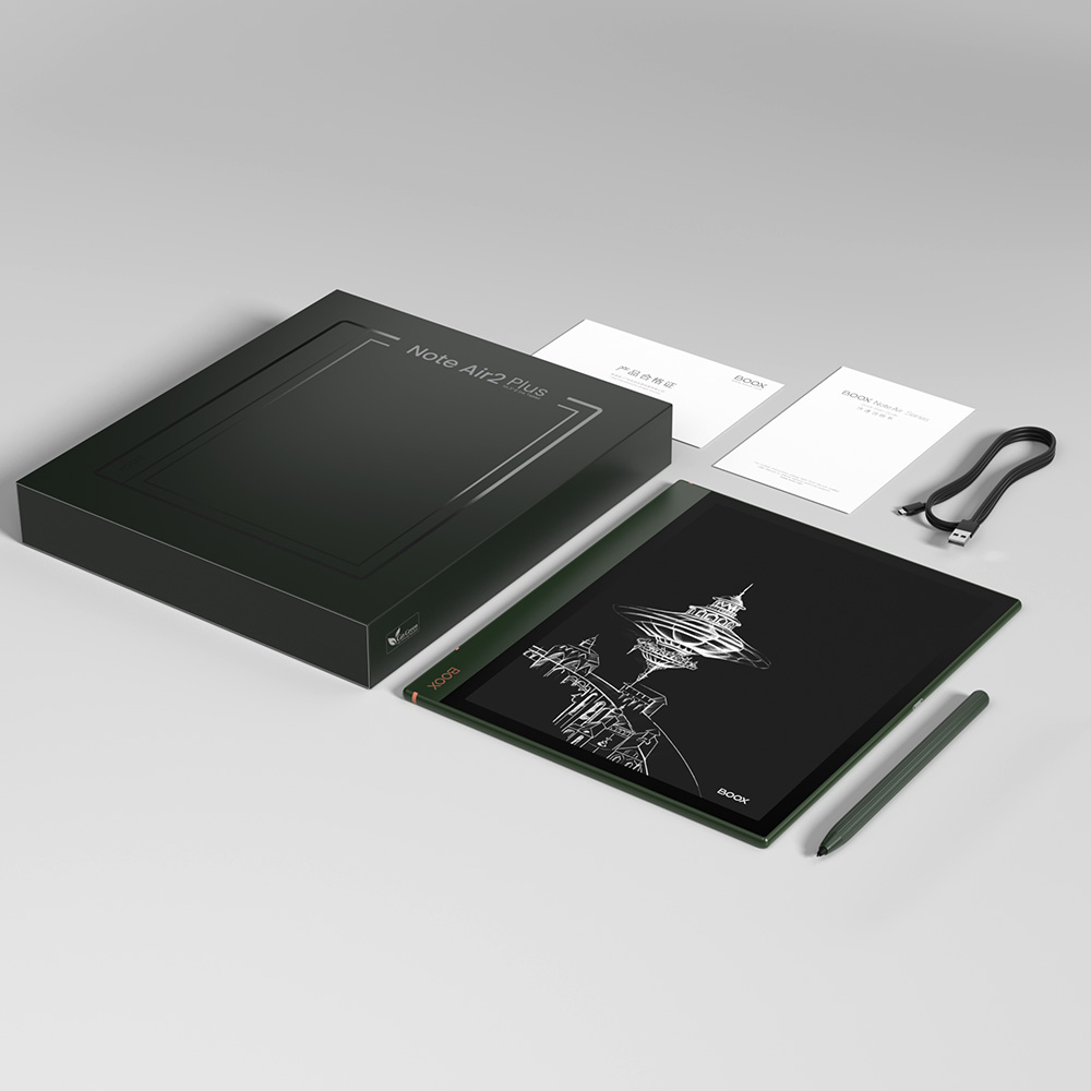 Onyx BOOX Note Air2 Plus X1,BOOX Pen Plus stylus with magnets X1,USB-C Cable X1,Quick Start Guide X1,Warranty Sheet X1