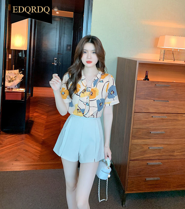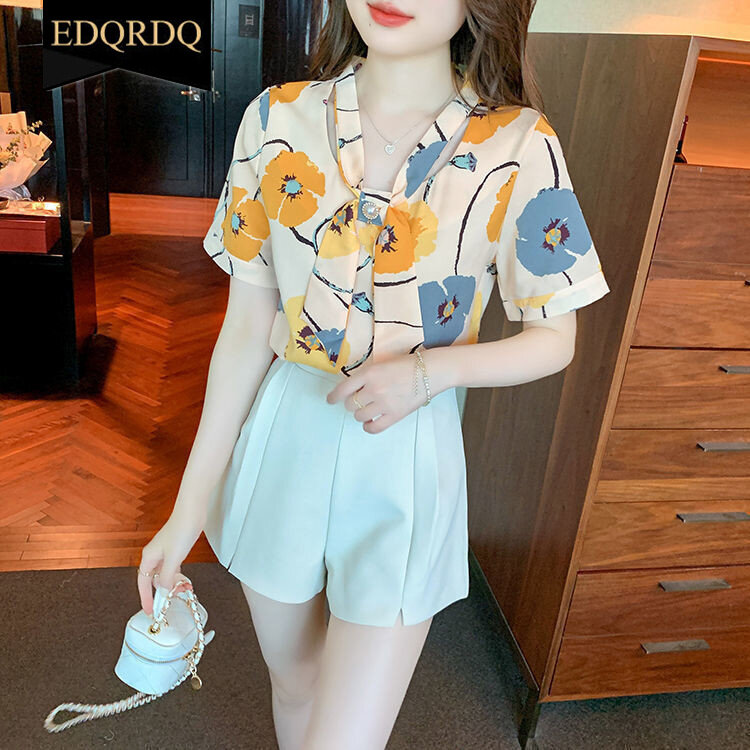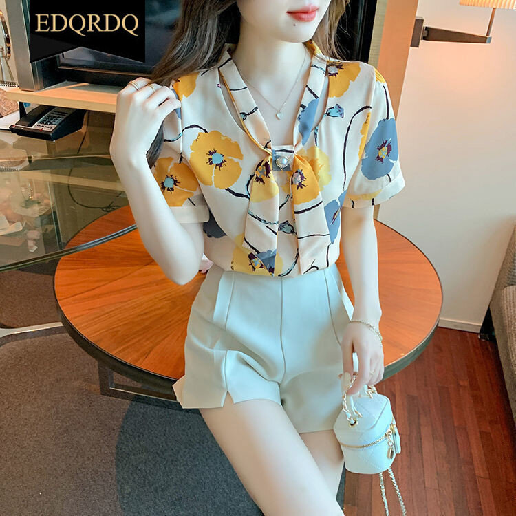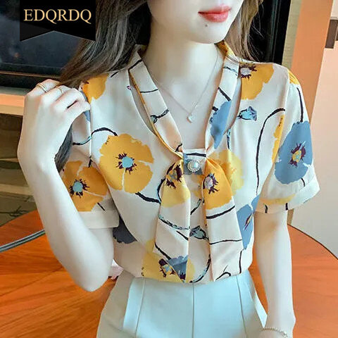 EDQRDQ Floral Chiffon Blouses Plus Size Pearl Elegant Design Short Sleeve Shirts Tops