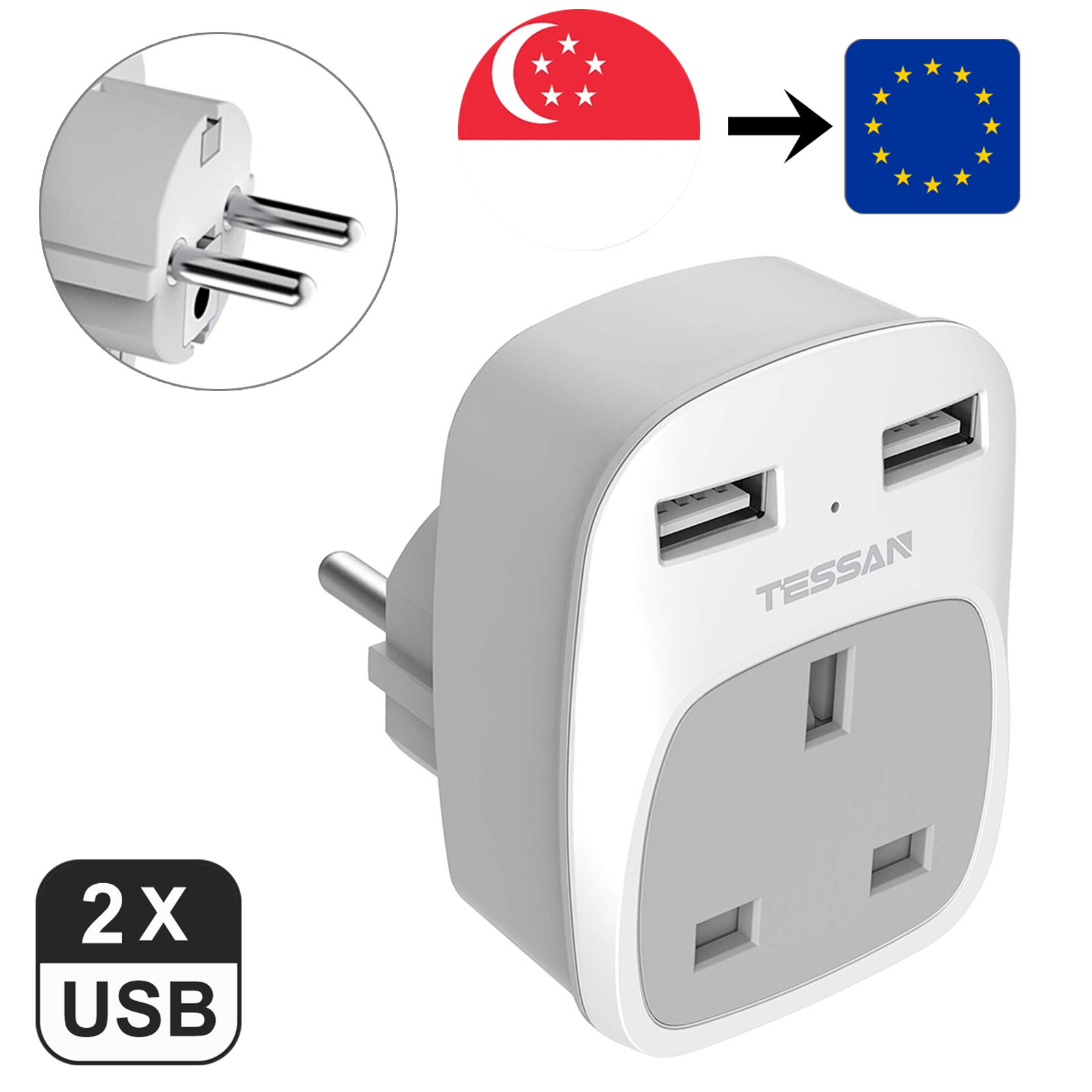 TESSAN European Plug Adapter Singapore to Europe Travel Adaptor with 2 USB, European Charger Multi Plug Extension Wall Charger USB Adapter Wall Socket Power Strip for Italy Switzerland Germany Spain F