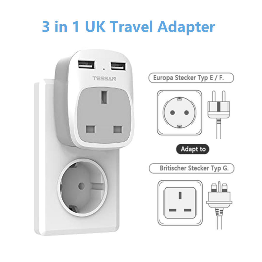 • Grounded Wall Outlet Adapter - This adapter accepts the standard UK plug. Max capacity up to 3250 Watt (max 250 Volt, 13 A). The Type E/F Plug is unlike the ungrounded type C of 4 mm pins but 4.8mm round pins, so it won't slip easily when plugged in the wall to charge your electronic devices.