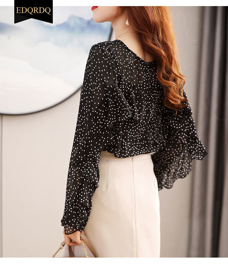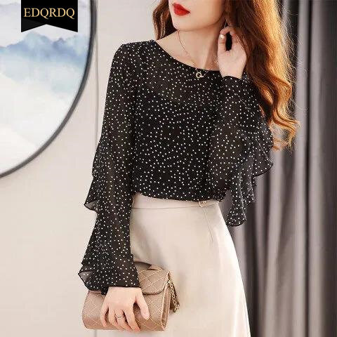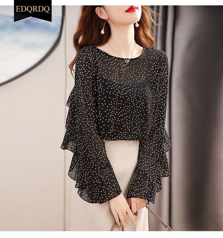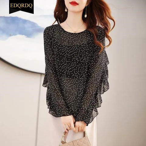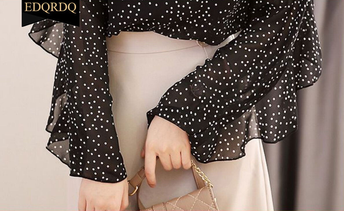 EDQRDQ Women's Crew Neck Ruffle Sleeve Shirts Elegant Polka Dots Print Workwear Blouse