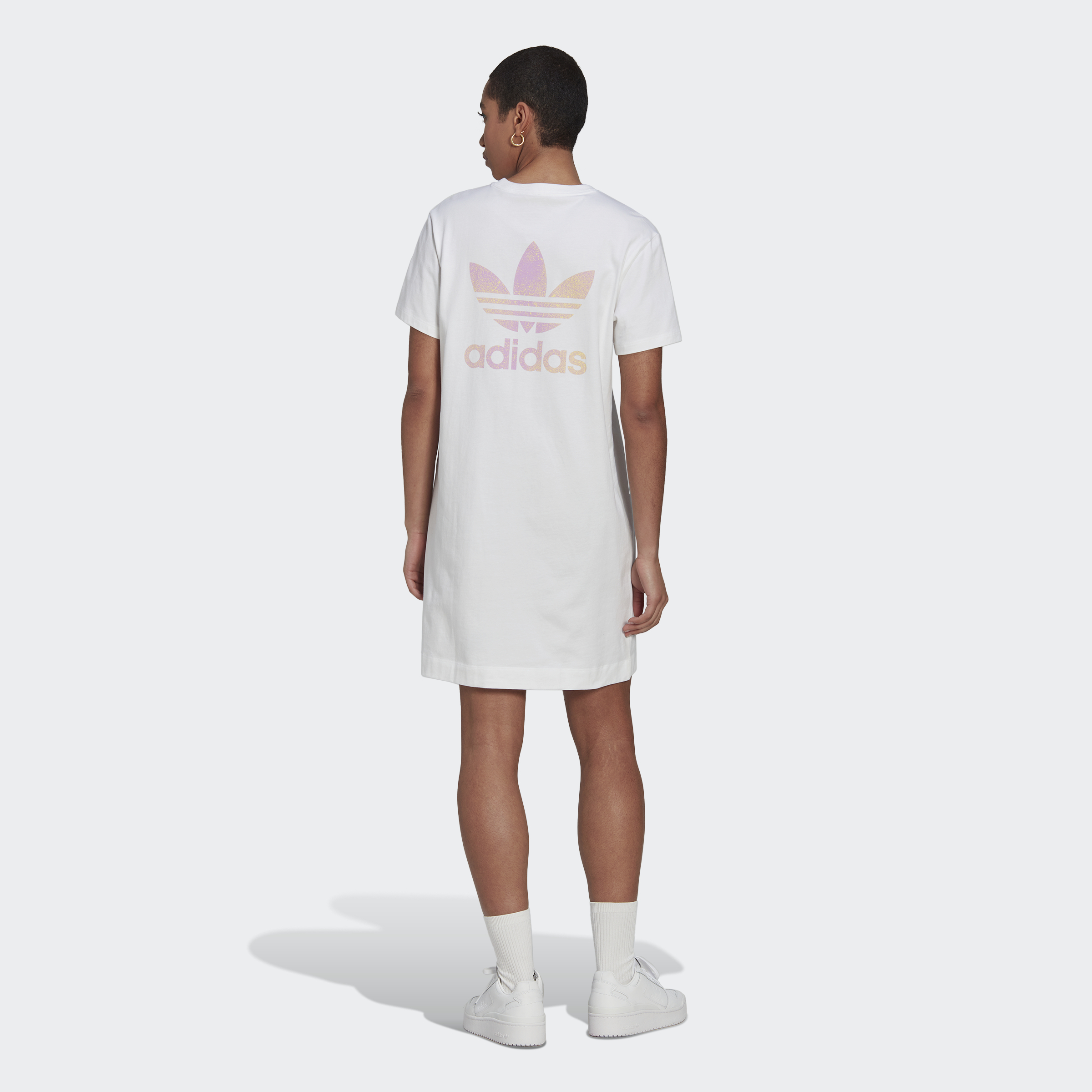 Floaty, roomy, casually cool. Kick back in the low-key comfort of this adidas tee dress. Made of pure cotton jersey for stretchable softness, it has a loose fit and ribbed crewneck that make it feel like your favourite tee — just oversized. The tie-dye Trefoil on the back gives it a pop of bright to keep things fresh. Our cotton products support more sustainable cotton farming.