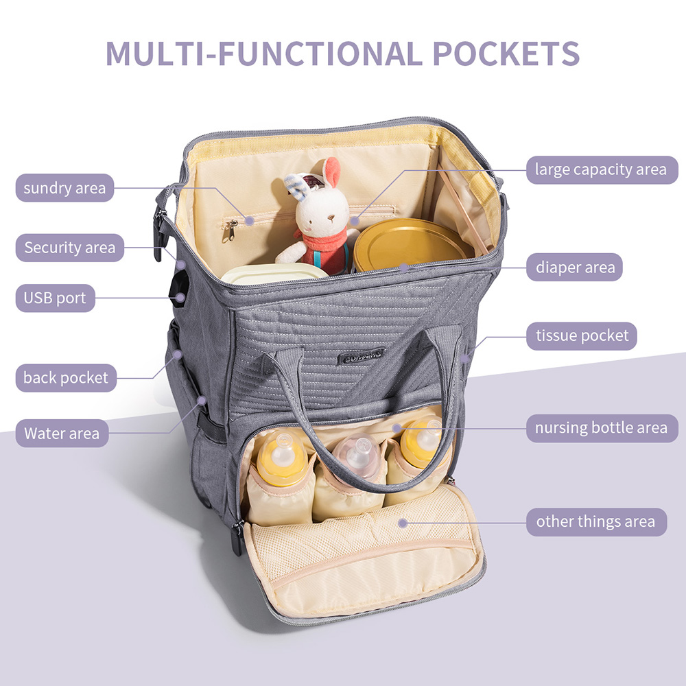 Tote around everything you need for babies, infants and toddlers with this baby diaper bag backpack that features 13 storage pockets and a USB port, complete with zippers for easy closure and three insulated pockets for bottles, snacks and more.