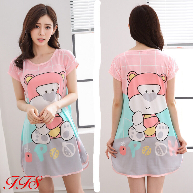 TFS Sleepwear for Women Short Sleeve Sleepwear Women Sleeping Dress Thin Cartoon Silk Pajamas Women