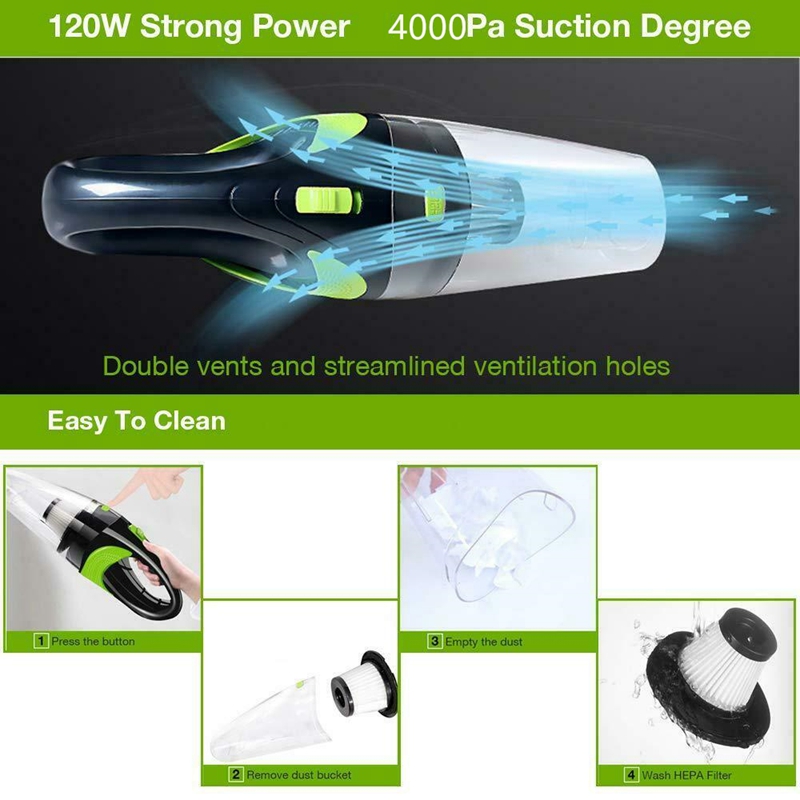 1. 3-in-1 Multiple Attachments-Cordless vacuum cleaner comes with 3 different attachments. Brush attachment for cleaning sensitive surfaces and removing animal hair from textiles. Rubber nozzle for cleaning up the spilled drinks. The crevice nozzle for cleaning hard-to-reach surfaces.;2. Cordless and Lightweight-Wireless handheld vacuum cleaner is lightweight and portable for use. Thanks to the low weight of only 0.78kg, all the accessories can be used with ease. You can fully enjoy the freedom of movement and effortlessly clean every corner of your home or car.;3. One-step To Remove Garbage-Car vacuum cleaner can help you to remove the garbage in one click. Just press the button, remove the vacuum container and empty the trash without Pressing the dirt.;4. Compact Design and Easy To Stow-The ergonomic design of hand vacuum cleaner allows one-handed operation. morden and simple, the storage is a breeze.5. Quick Clean You Home and Car-Handheld vacuums can quick clean up all garbage in seconds, great for cleaning dust, crumbs, as well as spilled milk and coffee. Show you a clean living space!Type: Cordless Car Vacuum CleanerVoltage: 12VVacuum degree: 4000kpaRated speed: 29000-31000rpmLithium battery model Battery capacity: 2700MAHRated power: 120WPower cord length: about 1mInstructions for use:1.Check if the charge is sufficient.2.Opened the switch.3.According to different use occasions to replace the use of different nozzles.4. This product is a wet and dry vacuum cleaner. Pay attention to timely opening the front cover drain when absorbing water.5.Rechargeable battery USB display red for normal charging, green for full.6.Charging time is about 3-4 hours full, full of sustainable use for 20-30 minutes.Size:35*11cmMaterial:ABSColour:Green+black+C