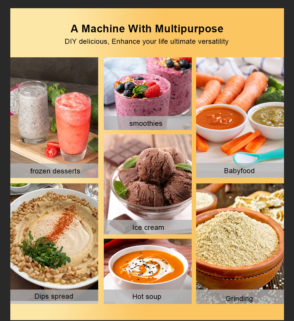 : The peak 2200W (rated 1500W) commercial-grade motor with hardened 6 stainless steel can easily break ice cubes and frozen fruits, it makes the large ice cube to small slush. Benefit from the WHOLE food by thoroughly pulverizing the ice cubes, frozen fruits, vegetables, seeds, nuts and much more.